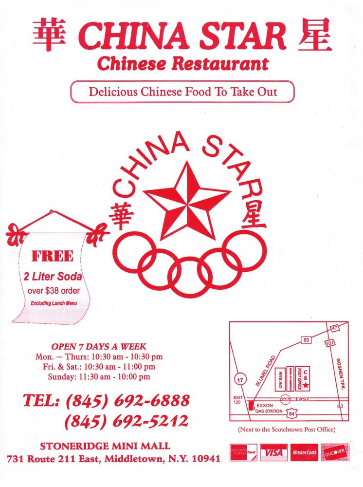 China Star Restaurant in Middletown, NY offers a variety of delicious Chinese dishes with options for takeout, delivery, and reservations. The menu boasts many vegetarian options and accepts credit cards for convenience. Customers rave about the crispy egg rolls and flavorful dishes like sesame chicken and pepper steak with onion. The friendly staff and prompt service make dining at China Star a pleasant experience every time. With a classy atmosphere and ample parking, it's a great spot for groups or families. Don't miss out on the BBQ beef sticks and combo platters that keep customers coming back for more. Overall, China Star Restaurant stands out for its consistency, quality, and tasty Chinese cuisine.